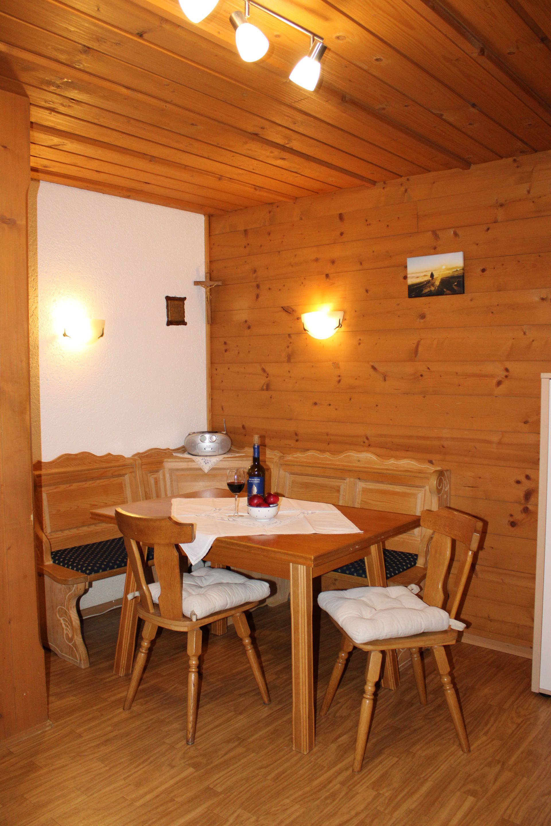 In der Küche befindet sich eine gemütliche Sitzecke. Die Küche ist komplett eingerichtet mit Geschirr, Tassen und Gläsern, Töpfen, Pfannen, Wasserkocher, Toaster, Kaffeemaschine sowie einer Kühl- Gefrierkombination.