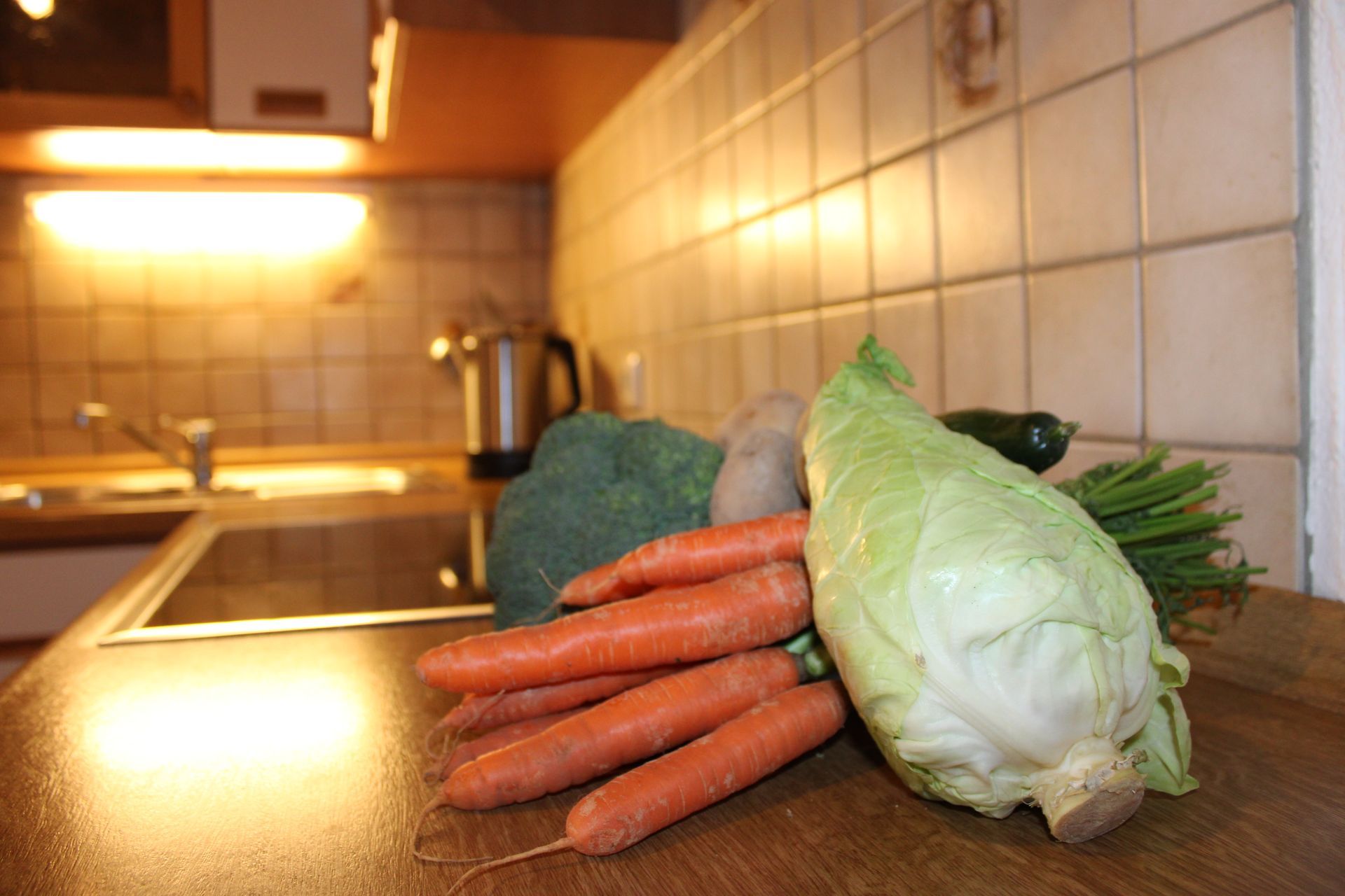 Das Schlafzimmer verfügt ebenso über ein Doppelbett und eine ausziehbare Couch im Wohnbereich. In der Küche gibt es eine Kochecke mit Backofen und 4 Kochplatten. Auch diese Küche ist komplett ausgestattet mit Geschirr, Tassen und Gläsern, Töpfen, Pfannen, Kaffemaschine, Wasserkocher und Toaster. Kühlschrank und Gefrierfach sind ebenso vorhanden.